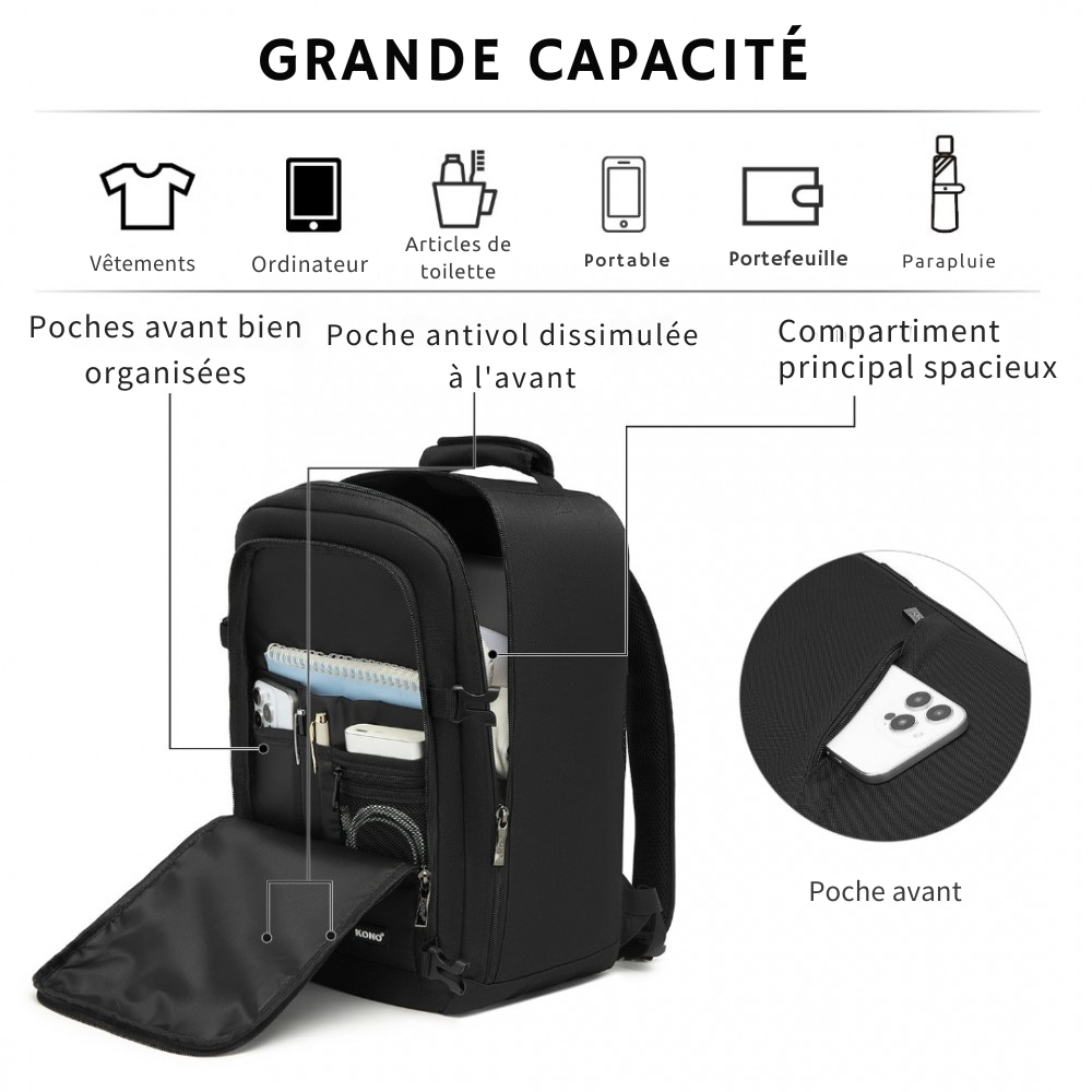 Parfait pour les voyageurs qui veulent maximiser leur confort tout en respectant les règles des compagnies aériennes. Sa double fermeture à glissière métallique robuste et ses coutures renforcées garantissent une longévité exceptionnelle, même après de multiples voyages. Embarquez sereinement avec ce sac à dos pratique et malin !