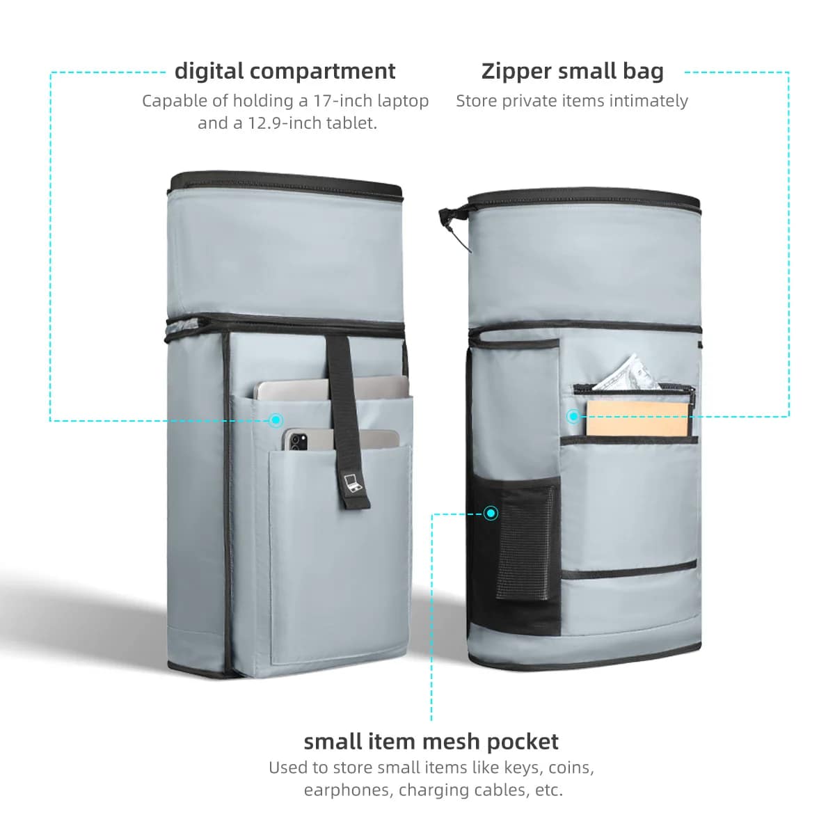 Les fermetures éclair bidirectionnelles et les coutures solides garantissent une sécurité optimale, tandis que le dos et les bretelles respirants réduisent la pression sur vos épaules. Pratique, durable et confortable, ce sac vous suit partout sans compromis.