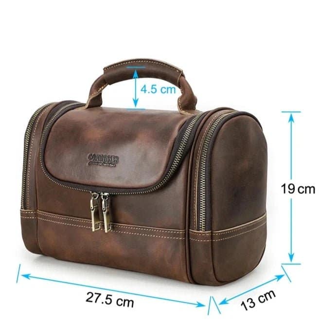 La trousse de toilette de voyage pour homme allie parfaitement style et durabilité grâce à son cuir de haute qualité au charme vintage. Résistante et épaisse, elle vous accompagne longtemps tout en affichant une élégance intemporelle. Pensée pour l’homme moderne, elle propose plusieurs compartiments et poches zippées qui facilitent une organisation optimale de vos affaires.