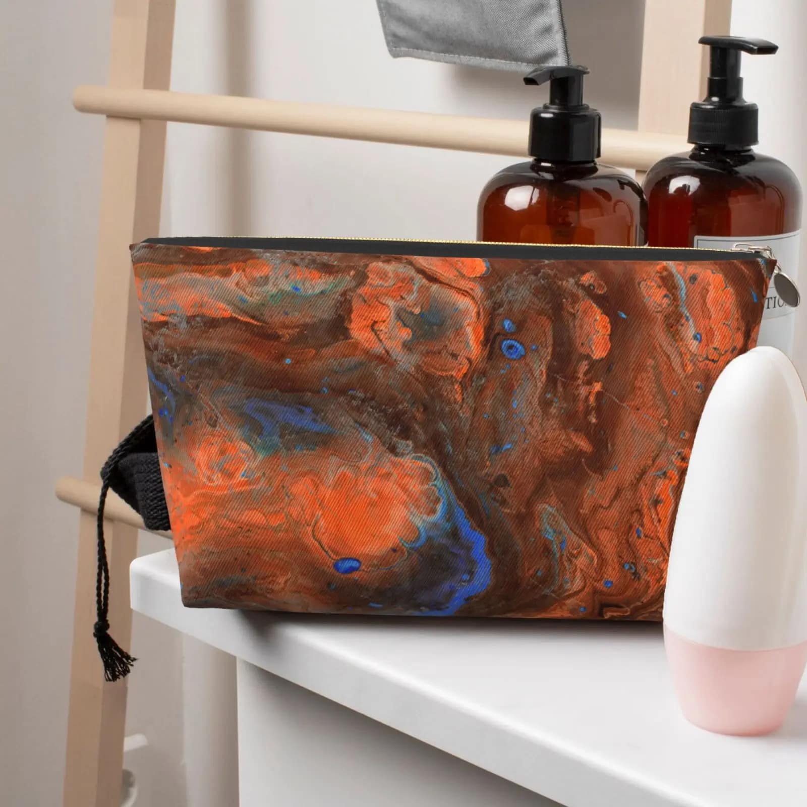 La trousse de toilette marbre se distingue par sa poche principale spacieuse et sécurisée par une fermeture à glissière robuste, offrant un espace de rangement simple et efficace pour tous vos essentiels. Conçue pour durer, elle est aussi facile à entretenir : un lavage doux à la main ou en machine suffit, sans repassage nécessaire. Laissez-la sécher naturellement pour préserver son allure élégante et durable.