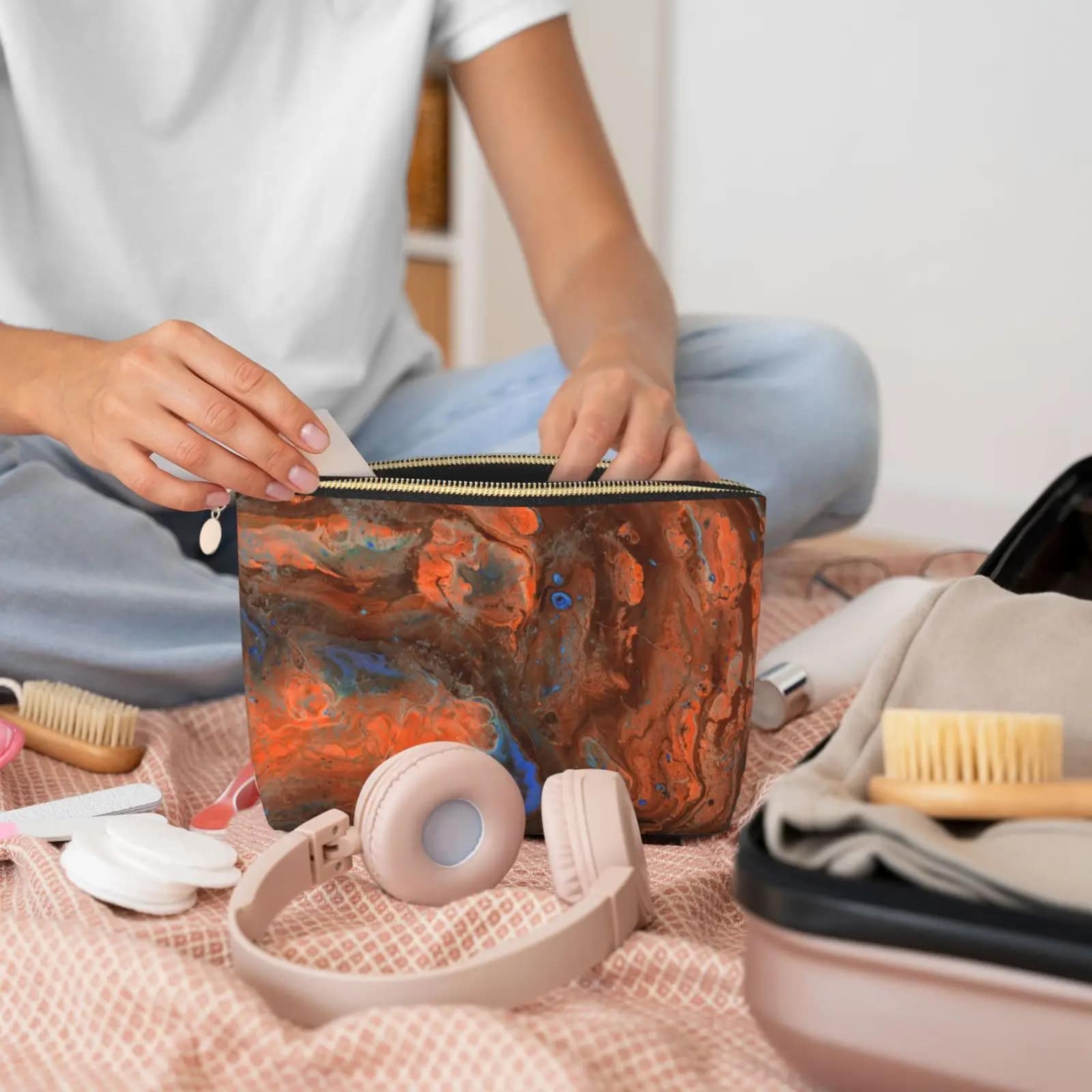 Idéale pour les déplacements quotidiens et les voyages courts, la trousse de toilette marbre se glisse aisément dans n’importe quel sac à dos, sac à main ou valise. Son format compact et son design élégant en font un accessoire discret et pratique pour transporter cosmétiques et essentiels en toute simplicité.